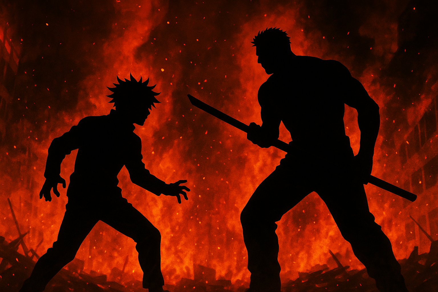 渋谷の街が燃え、崩壊していく様子は、ただの背景ではなく戦闘の臨場感を最大限に引き立てる演出として活かされています。